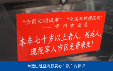 常運(yùn)出租駕駛員盛凱(常州市十佳文明出租車(chē)駕駛員)發(fā)起“三免車(chē)輛”( 即:現(xiàn)役軍人、70歲以上老人、殘疾人市區(qū)免費(fèi)乘坐),得到了多位駕駛員的響應(yīng),公司現(xiàn)已成立常運(yùn)出租藍(lán)海豚愛(ài)心車(chē)隊(duì),為特殊群體出行提供免費(fèi)乘車(chē)服務(wù)。