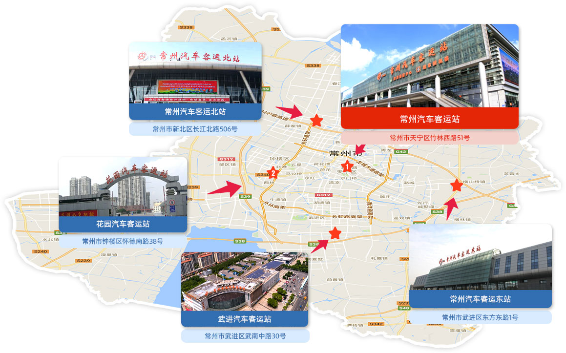 常州汽車客運站于2010年建成,地處常州北大門,是集高鐵、地鐵、公交為一體的綜合樞紐客運站。車站擁有11000平方米的候車、售票廳和32600平方米停車場,內(nèi)設售票窗口5個,檢票窗口30個,是常州地區(qū)最大的公路客運站。