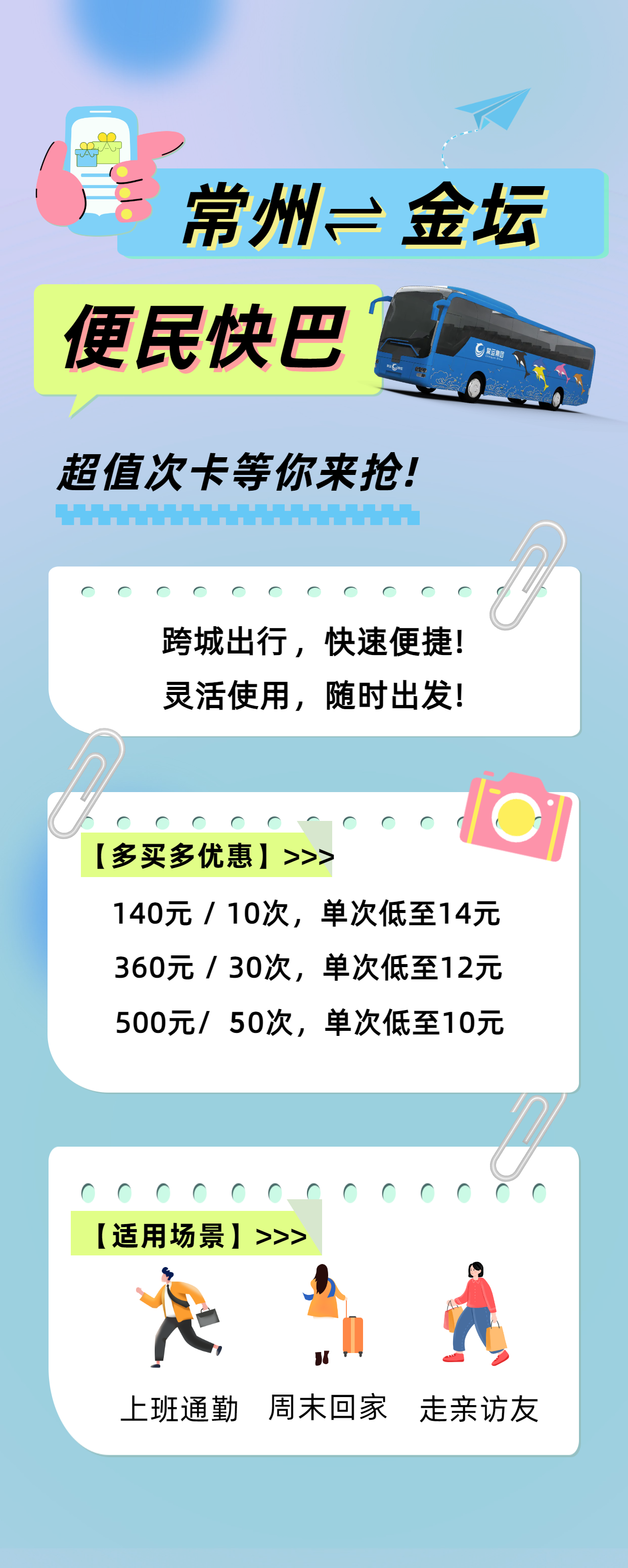 為進(jìn)一步提升出行體驗(yàn),常州至金壇便民快巴近日推出超值次卡,為廣大市民提供更加優(yōu)惠、便捷的出行選擇。此次推出的次卡共分為三檔:140元10次、360元30次、500元50次,具體購(gòu)買及使用方式可關(guān)注“常州汽車站”公眾號(hào)了解詳情。